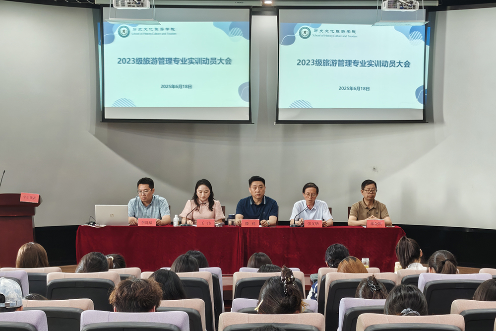 为深化学生对专业实训认知、强化实践能力,6月18日下午,历史学院在弘文楼3-阶201举行2023级旅游管理专业实训动员大会。历史学院党委书记滕祥、院长张文华、院关工委常务副主任邵金凯、旅游管理系主任李群绩、实训指导老师以及2023级实训学生参加本次动员会。会议由历史学院党委副书记王玮主持。