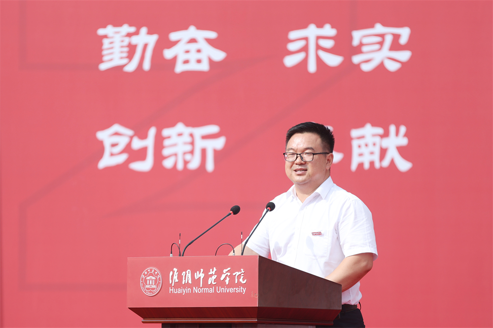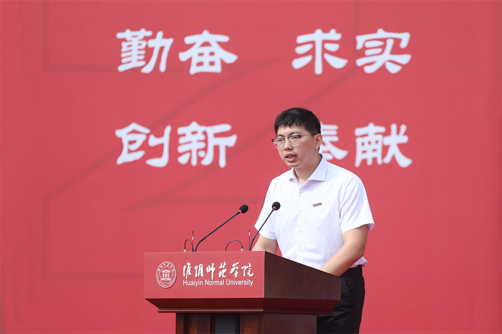 优秀校友代表、全国道德模范提名奖获得者吴凯发言。他说,追求,是一步一步走出来的温暖。他深情回顾了在淮师求学以及在大山教书20余年的难忘经历,这些让他对“追求”有了更深的体会。他给学弟学妹们提出三点建议:多尝试、交朋友、爱自己。他说,淮师是一所有底蕴、有温度的学校,传授我们的不仅是知识,更是一种精神,希望大家在奔赴理想的路上,一步一个脚印,走得坚定,也走得温暖。